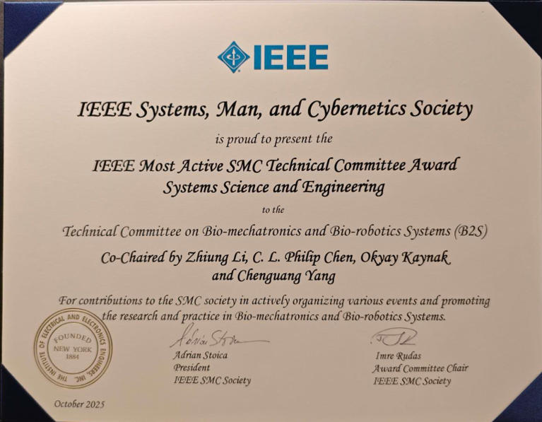 做为IEEE SMC Technical Committee on Bio-mechatronics and Bio-robotics Systems,李智军传授率领朝气电取仿朝气器人系统手艺委员会克意朝上进步,凭仗其正在手艺立异、学术勾当组织、跨学科合做及学术社区扶植等方面的杰出表示,从70多个手艺委员会中脱颖而出,荣获该项。